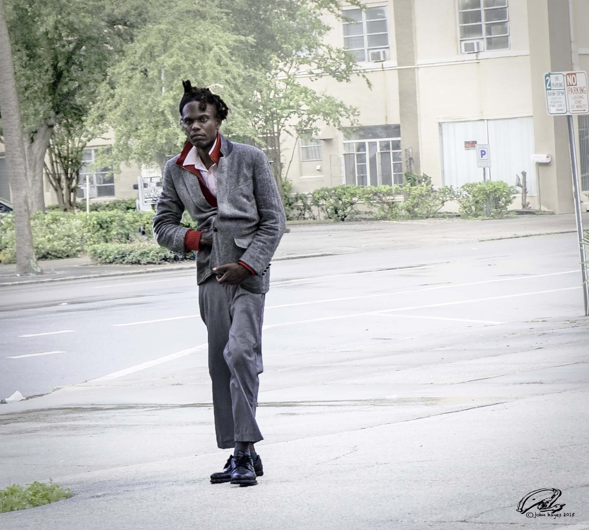 In the heat of the moment I am more and more convinced that we see what we are primed to see. I initially thought gun but then began to have my doubts. He wasn’t real sure I was taking his picture as there was a large mural just off stage that I had been looking at. It was a Sunday morning and maybe he was on his way to church. He never removed his hand from his coat and close inspection now suggests to me that he is cradling – using both hands, notice – a rectangular object, perhaps a computer.